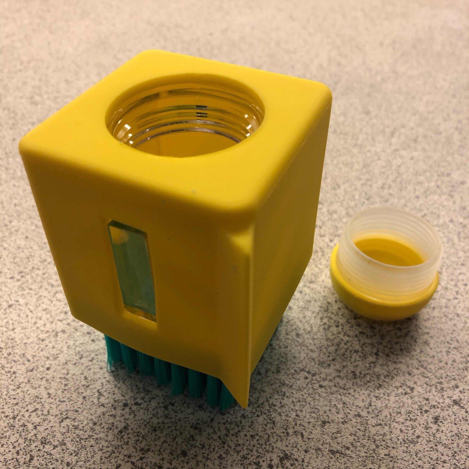 Man kan desuden påfylde opvaskesæbe i terningen og når man så vasker, trykker man sæben ud i børsten. Det er smart!